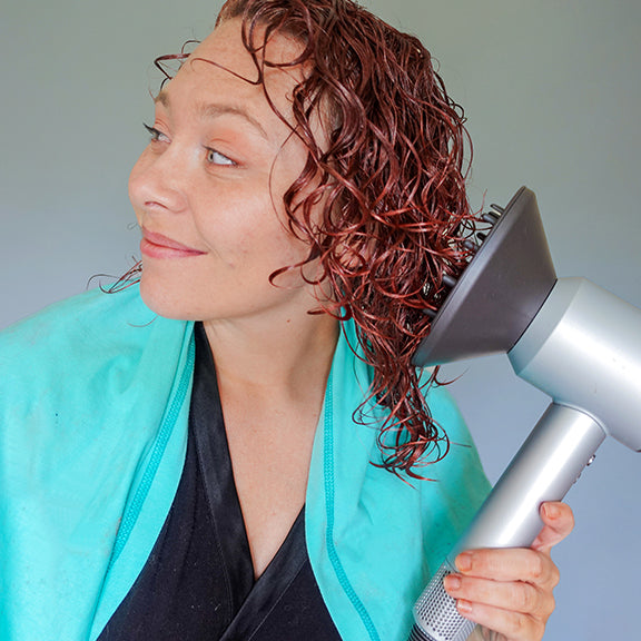 Select your desired styling method (scrunch/fingercurls/shingle) to enhance and define. Dry with a diffuser to allow the color to set.